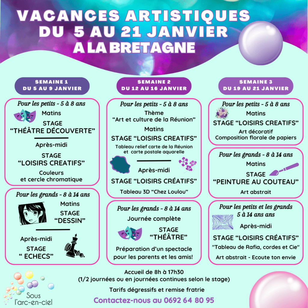 Les ateliers (mentionnés « Ateliers ») se déroulent sur des 1/2 journées. Parfois 1 atelier se déroule sur plusieurs demi-journées, temps de séchage oblige. Contactez nous au 0692648095 pour vous renseigner sur le programme détaillé des vacances.